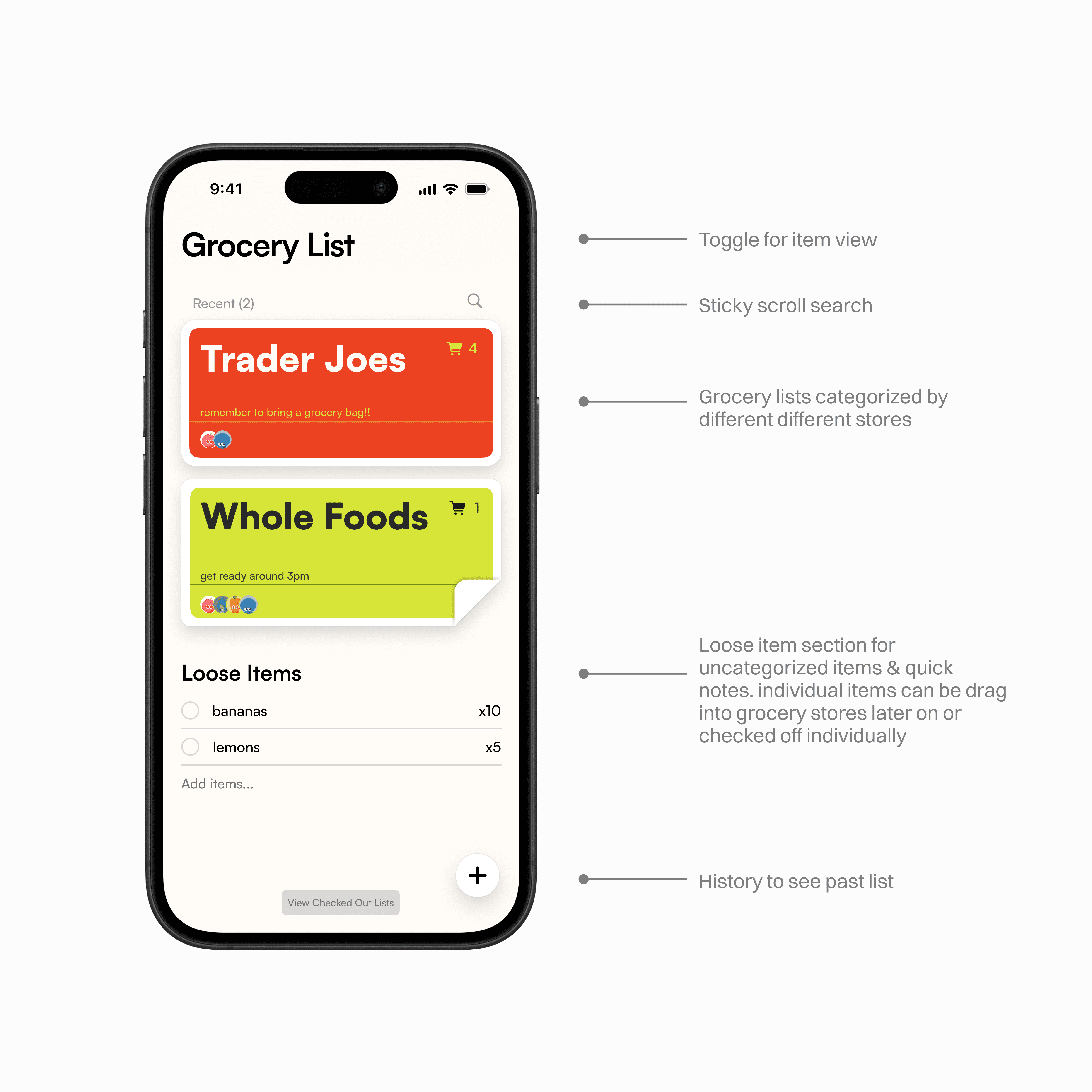 The shop function started as my personal frustration with documenting loose grocery lists into the notes app every time I go shopping. Although it was quick, there was no way to organize the items, resulting in a collection of messy lists and loose items.