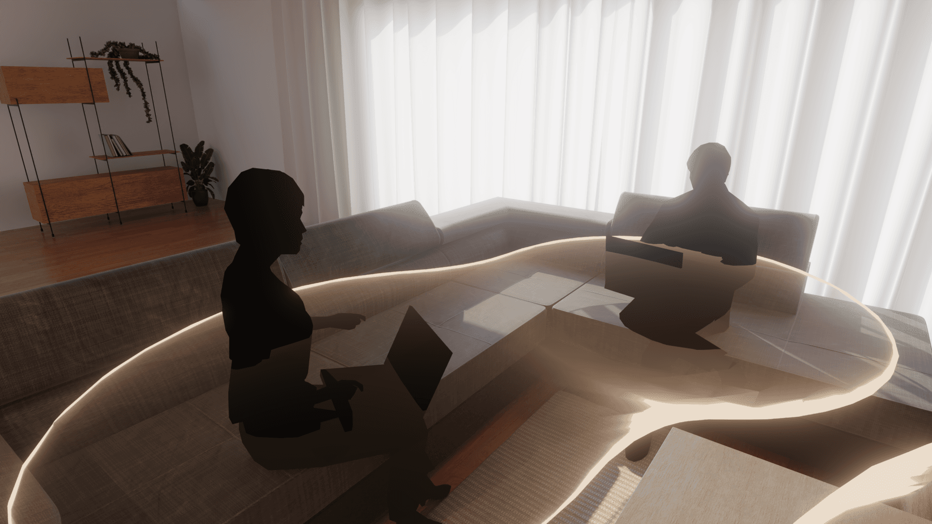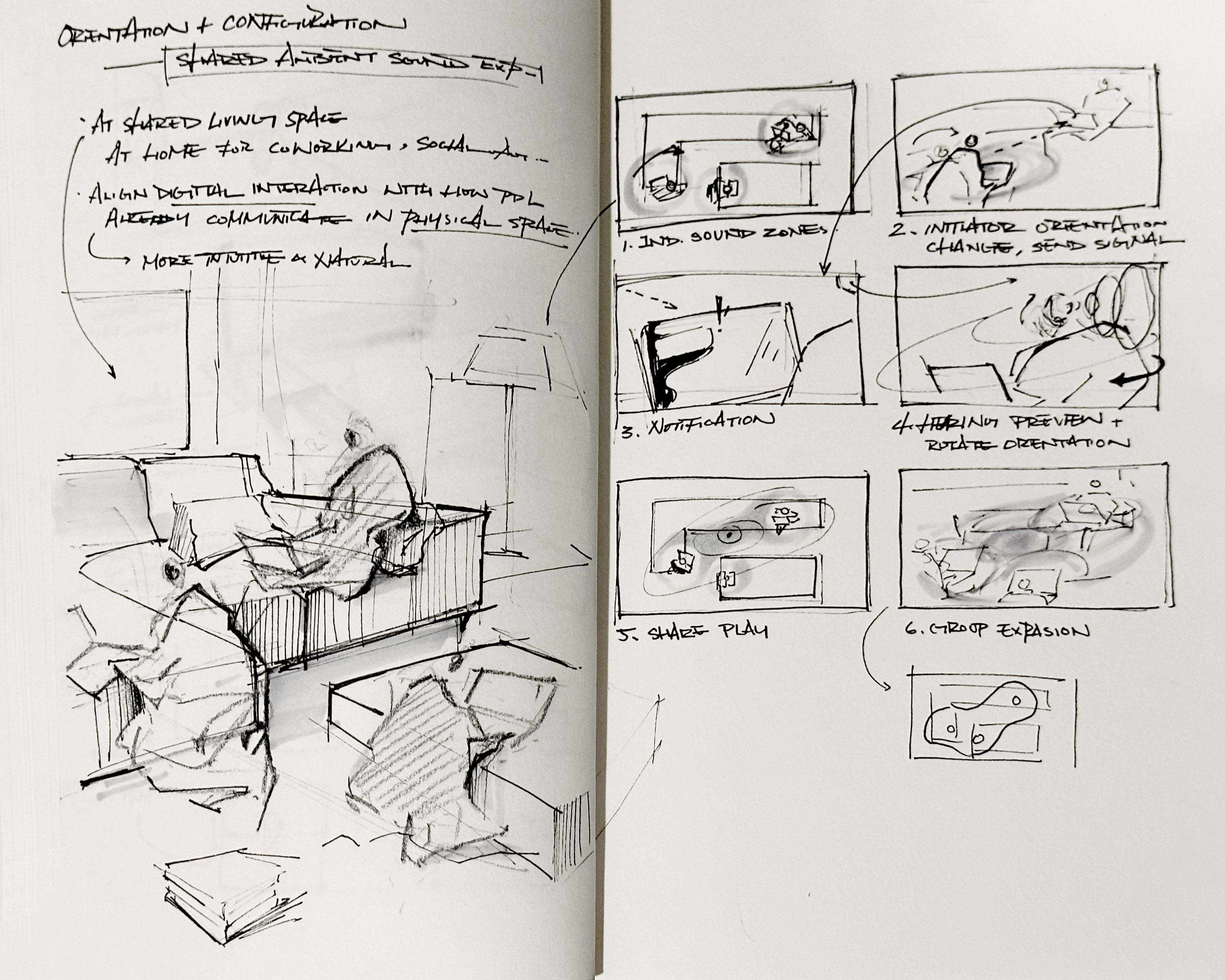 This project explores how people orient themselves in shared home workspaces, proposing a concept where body orientation shapes personal and shared soundscapes, allowing focus zones to subtly expand or merge as people turn toward one another.